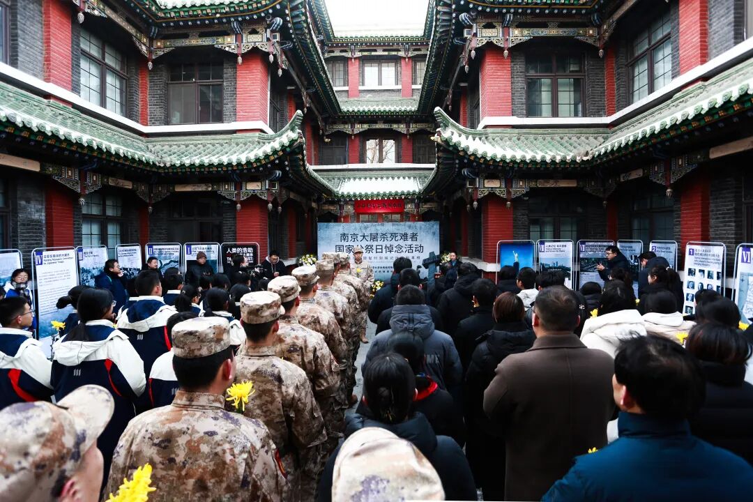 吉林长春。伪满皇宫博物院暨东北沦陷史陈列馆举行悼念活动。上午10时整,活动开始,现场奏唱中华人民共和国国歌。国歌唱毕,全场向南京大屠杀死难同胞以及所有在抗日战争中罹难的同胞默哀一分钟,沉痛悼念,寄托无尽哀思。随后,活动举行庄严的宣誓仪式,社会各界人士向英烈名录墙敬献鲜花,以此表达对英烈的深切哀悼与无尽哀思。