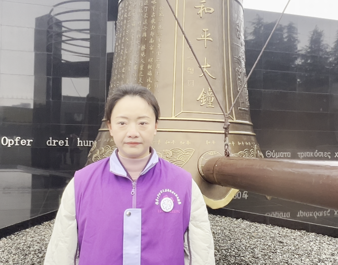 “紫金草”志愿者史慧慧已在馆服务4年,她说:“没有经历过战争的我们何其幸运,愿世界人民共享和平”。