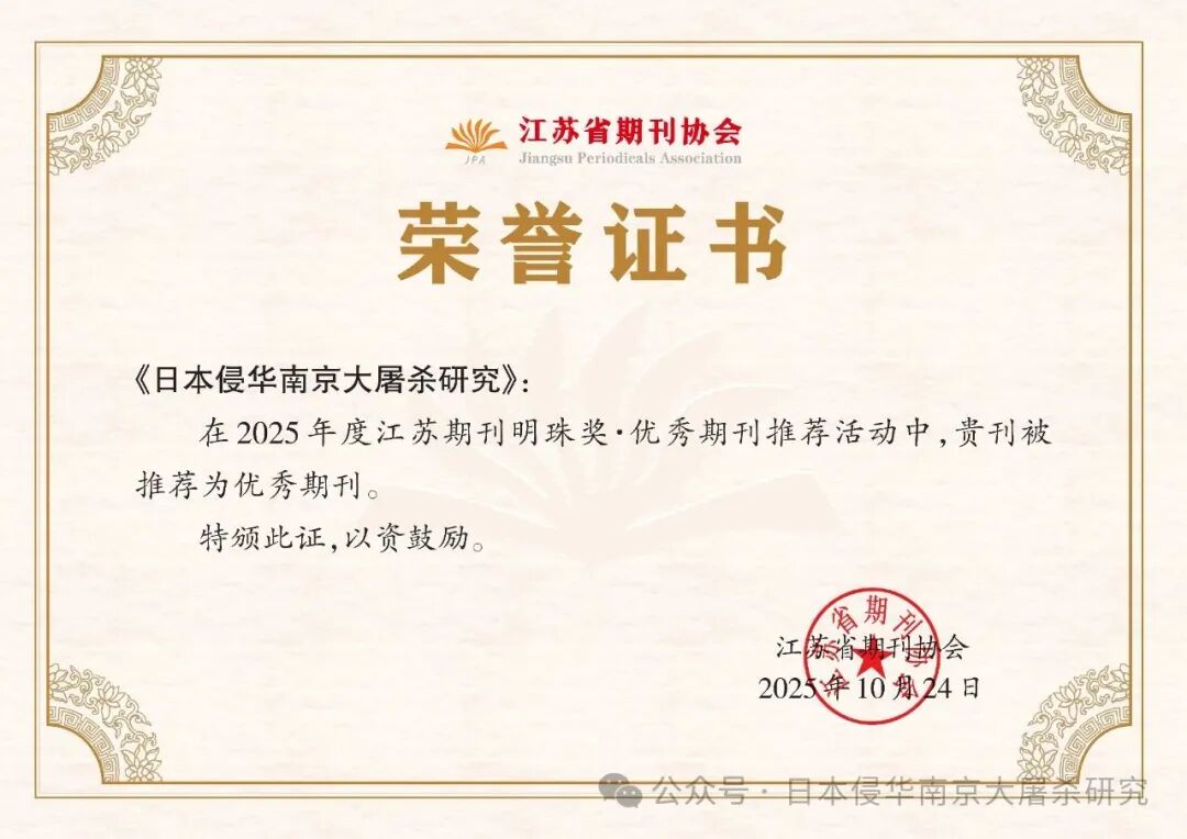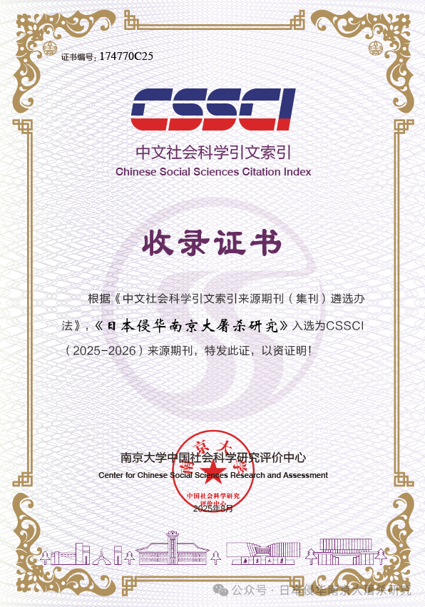 2025年8月,根据《中文社会科学引文索引来源期刊(集刊)遴选办法》,经南京大学中国社会科学研究评价中心评定,《日本侵华南京大屠杀研究》入选“CSSCI(2025—2026)来源期刊”,这是继入选CSSCI收录集刊、扩展版来源期刊后首次入选来源期刊。
