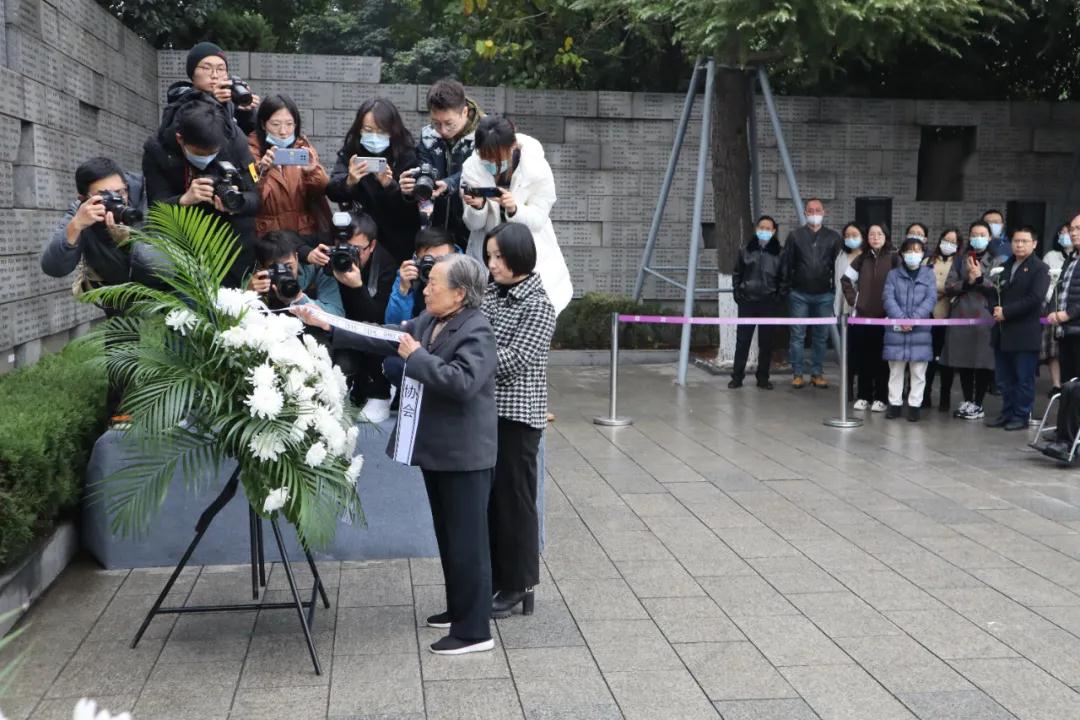 南京大屠杀幸存者夏淑琴在家人陪同下,向遇难亲人敬献菊花