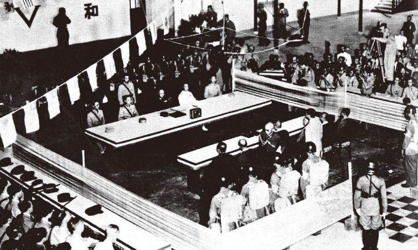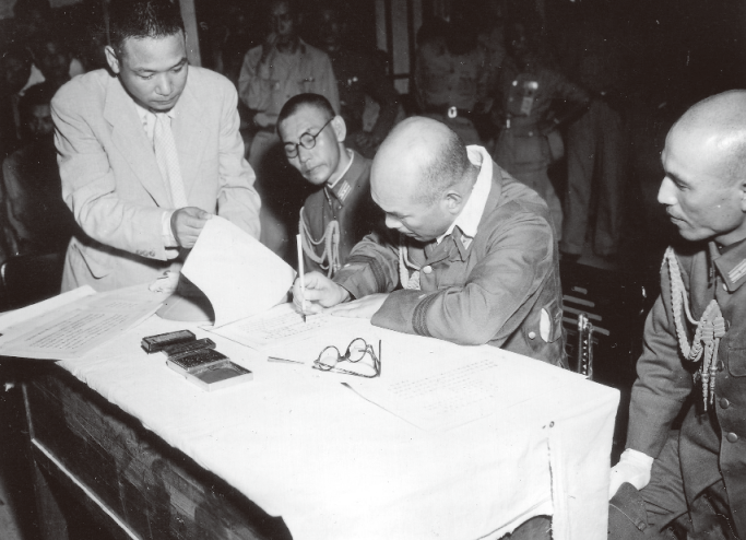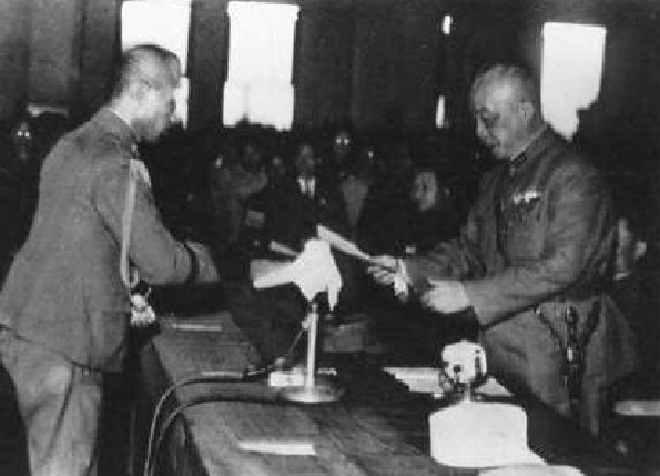 日本中国派遣军参谋长小林浅三郎向中国陆军总司令何应钦呈递《降书》