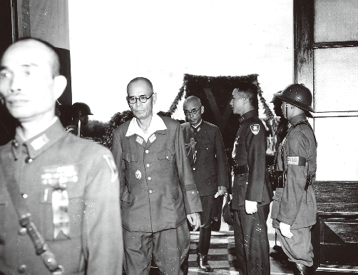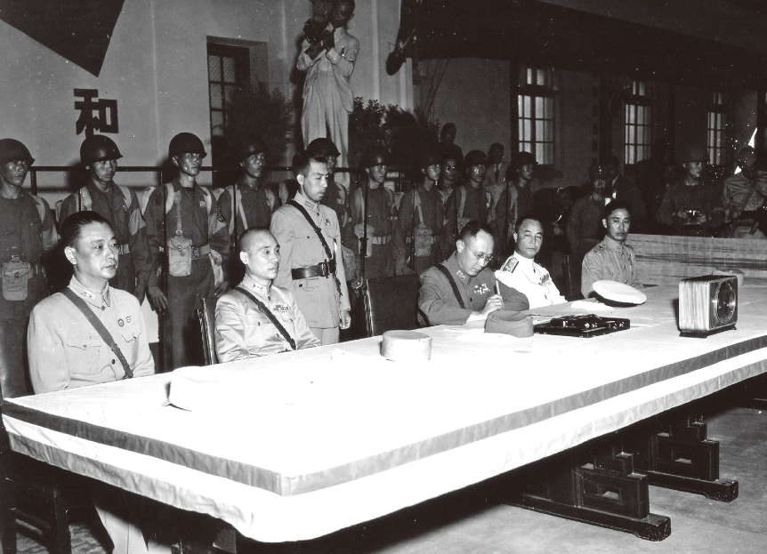 台湾省行政长官兼台湾警备总司令陈仪(右)接受日本台湾军参谋长谏山春树(左)呈递的降书