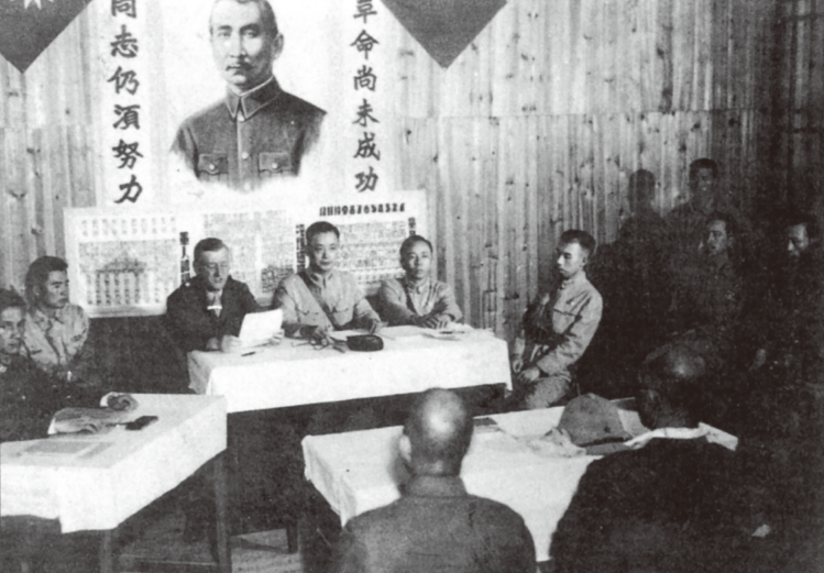 中国陆军参谋长萧毅肃(中)、副参谋长冷欣(右)、中国战区美军作战司令部参谋长柏德诺(左)在芷江洽降会场