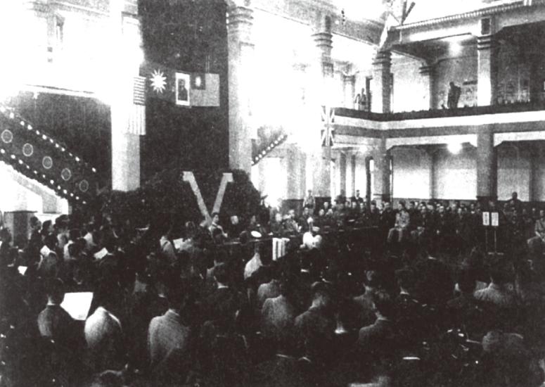 中国战区日军投降签字典礼确定在9月9日上午9时举行,地点在原中央陆军军官学校大礼堂。礼堂中挂满了各色彩布,正中悬挂着中、美、英、苏四国的大幅国旗。礼堂中央为受降席,席前设有一较小长桌,为日军投降代表席,左侧为高级将领席及中国记者席,右侧为盟国军官席及外国记者席。