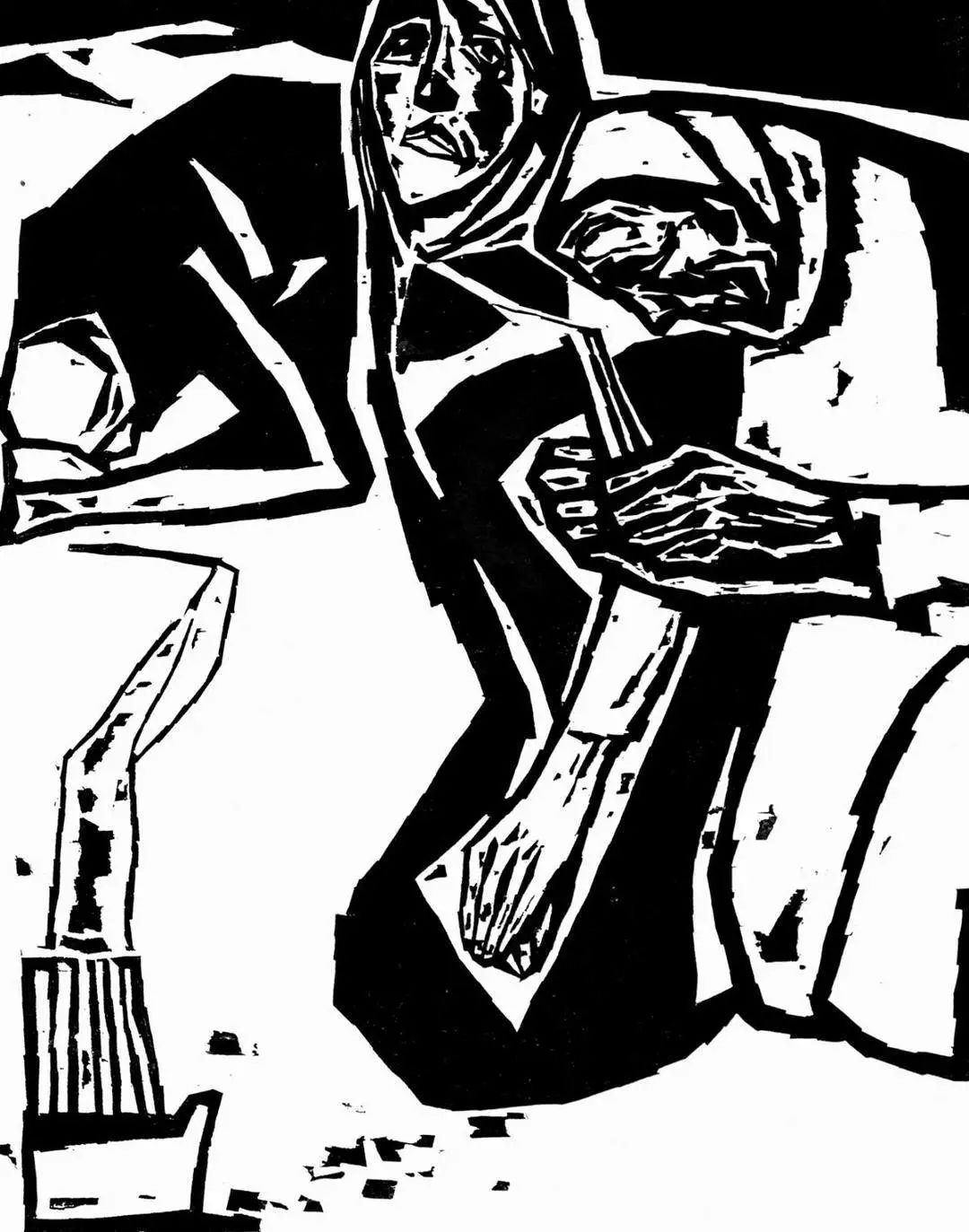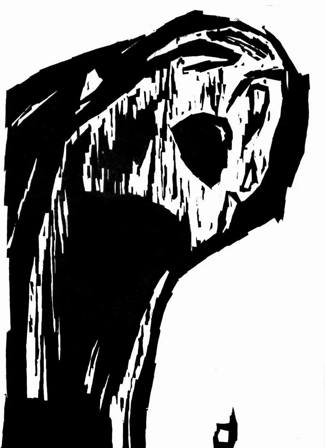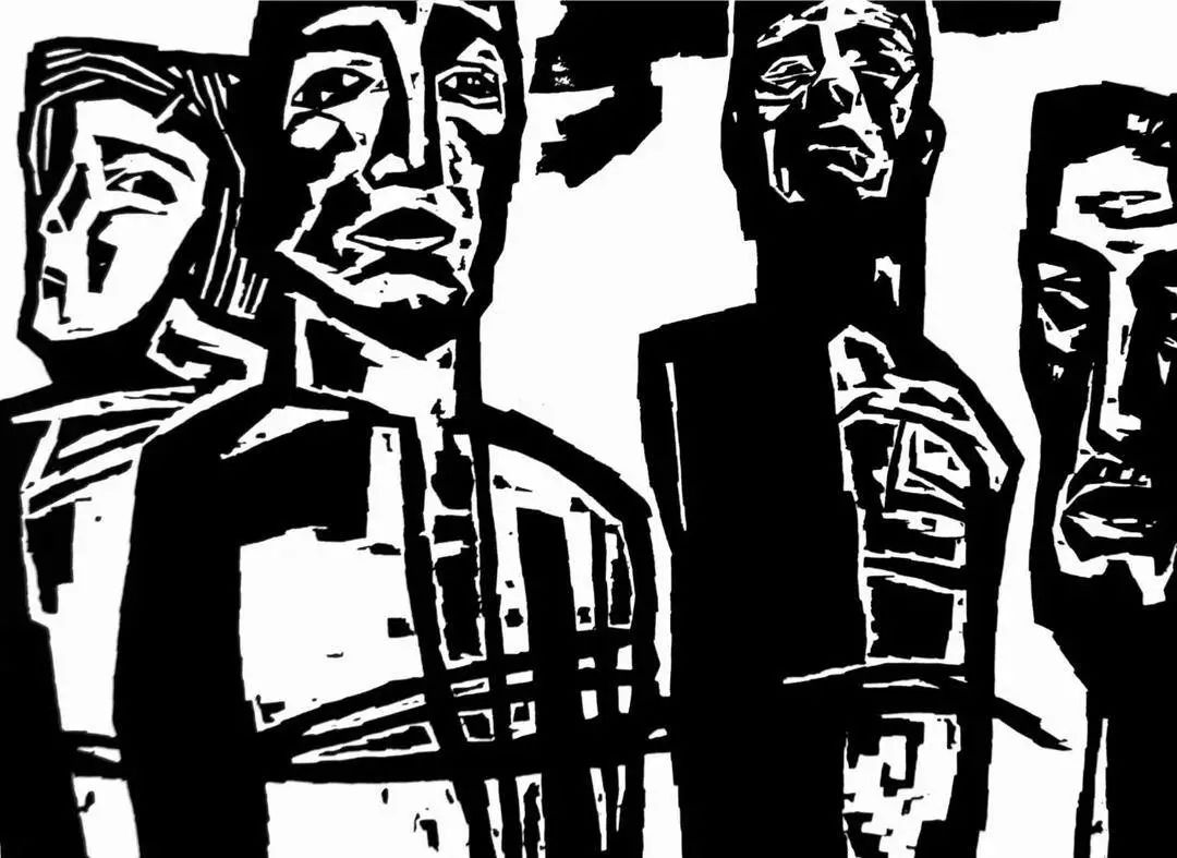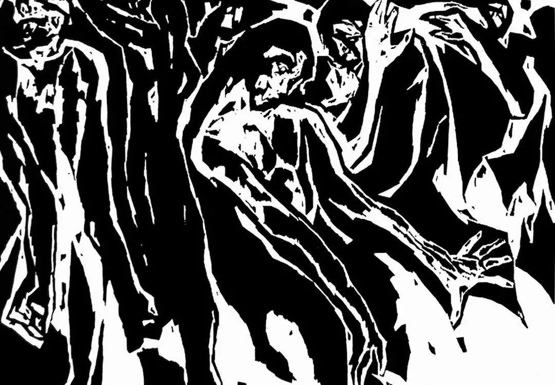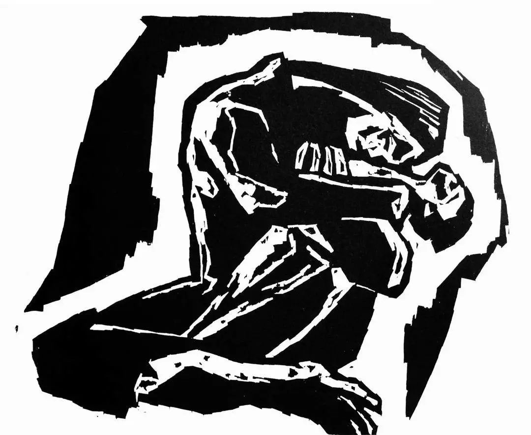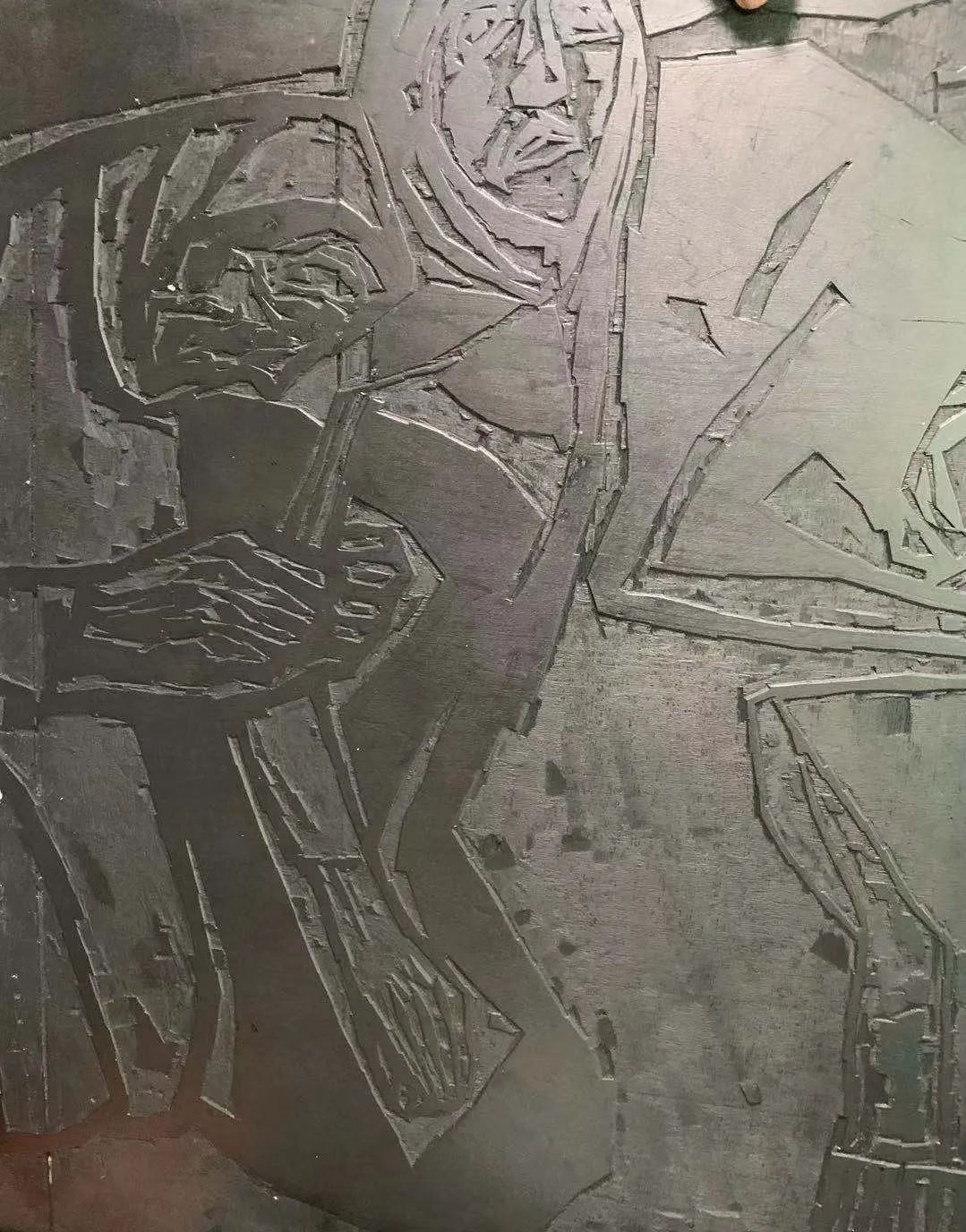 这幅大画在完成构思和绘制草图后,光是上板刻,就刻了一年之久。由于是黑白版画,必须当天印完,从早晨一直印到晚上才完工。它像宽银幕一样的巨大画面,拉开了悲剧的序幕,把人们引向血雨腥风的往昔。