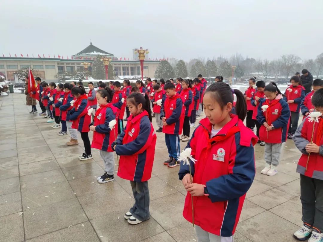 山东枣庄。台儿庄大战纪念馆举行同步悼念活动。纪念馆工作人员、台儿庄区明远实验小学学生及社会各界人士在台儿庄大战纪念碑前默哀、献花,表达对革命先烈的深切缅怀和崇高敬意。纪念馆讲解员为同学们带来了一场红色沉浸式剧目演出。