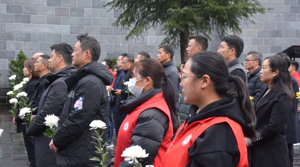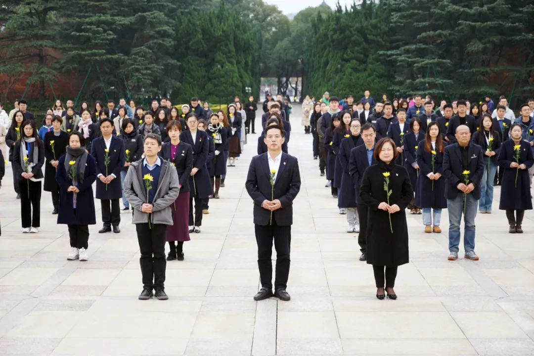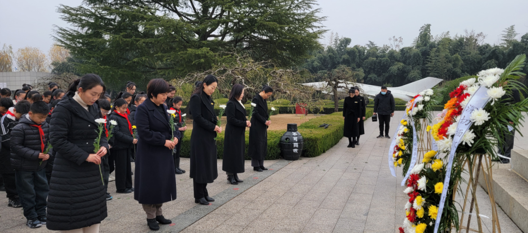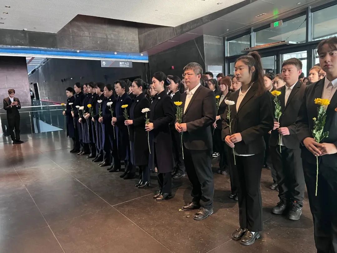 上海。龙华烈士纪念馆全体干部职工为死难同胞默哀、敬献鲜花,表达哀思。