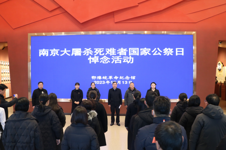 在中国博物馆协会纪念馆专业委员会与我馆共同倡议下,12月13日,北京、上海、延安、沈阳、旅顺、抚顺、哈尔滨、芷江、东莞、腾冲、武乡、盐城等地的纪念馆(博物馆)与南京同步举行悼念活动,深切缅怀南京大屠杀的无辜死难者,缅怀惨遭日本侵略者杀戮的死难同胞,缅怀为中国人民抗日战争胜利献出生命的革命先烈和民族英雄,缅怀同中国人民携手抗击日本侵略者而献出生命的国际战士和国际友人,表达中国人民坚定不移走和平发展道路的崇高愿望,宣示中国人民牢记历史、不忘过去,珍爱和平、开创未来的坚定立场。