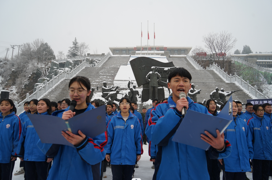 北京。雪花纷飞中,中国人民抗日战争纪念馆携手部分首都高校师生举行同步悼念活动。现场,北京印刷学院学生代表以《和平宣言》为基础进行“铭记历史 珍爱和平”主题演讲,饱含深情、铿锵有力的声音向世界发出和平祈愿,表达了青年学子爱国情感和奋斗志向。