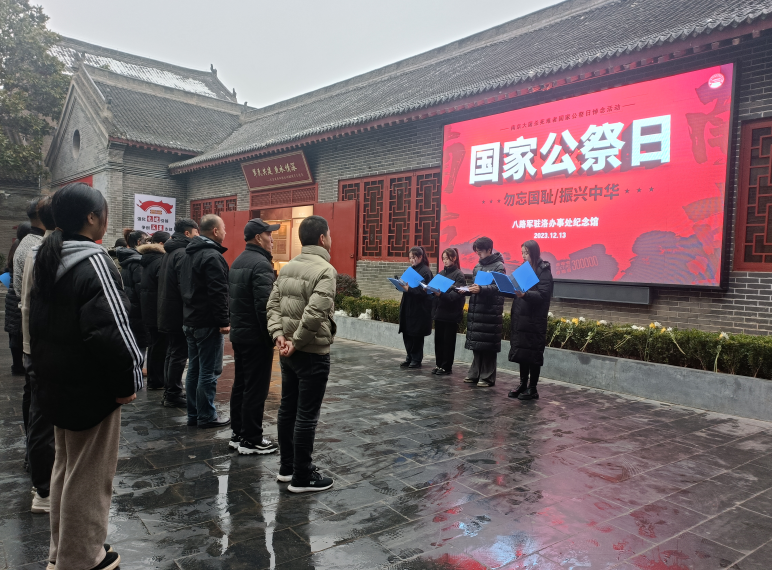 甘肃兰州。八路军兰州办事处纪念馆与兰州城市学院马克思主义学院共同开展悼念活动,纪念馆工作人员、有关单位师生代表共计80余人参加。全体人员在“抗日阵亡将士纪念墙”前举行敬献花篮仪式,纪念馆讲解员朗诵诗歌《南京大屠杀·公祭》。