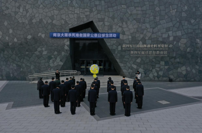 江苏溧阳。新四军江南指挥部纪念馆举行同步悼念活动。纪念馆工作人员、观众等30余人参加。大家向遇难同胞敬献花圈、默哀。纪念馆讲解员为大家带来微党课《铁军铁纪》。