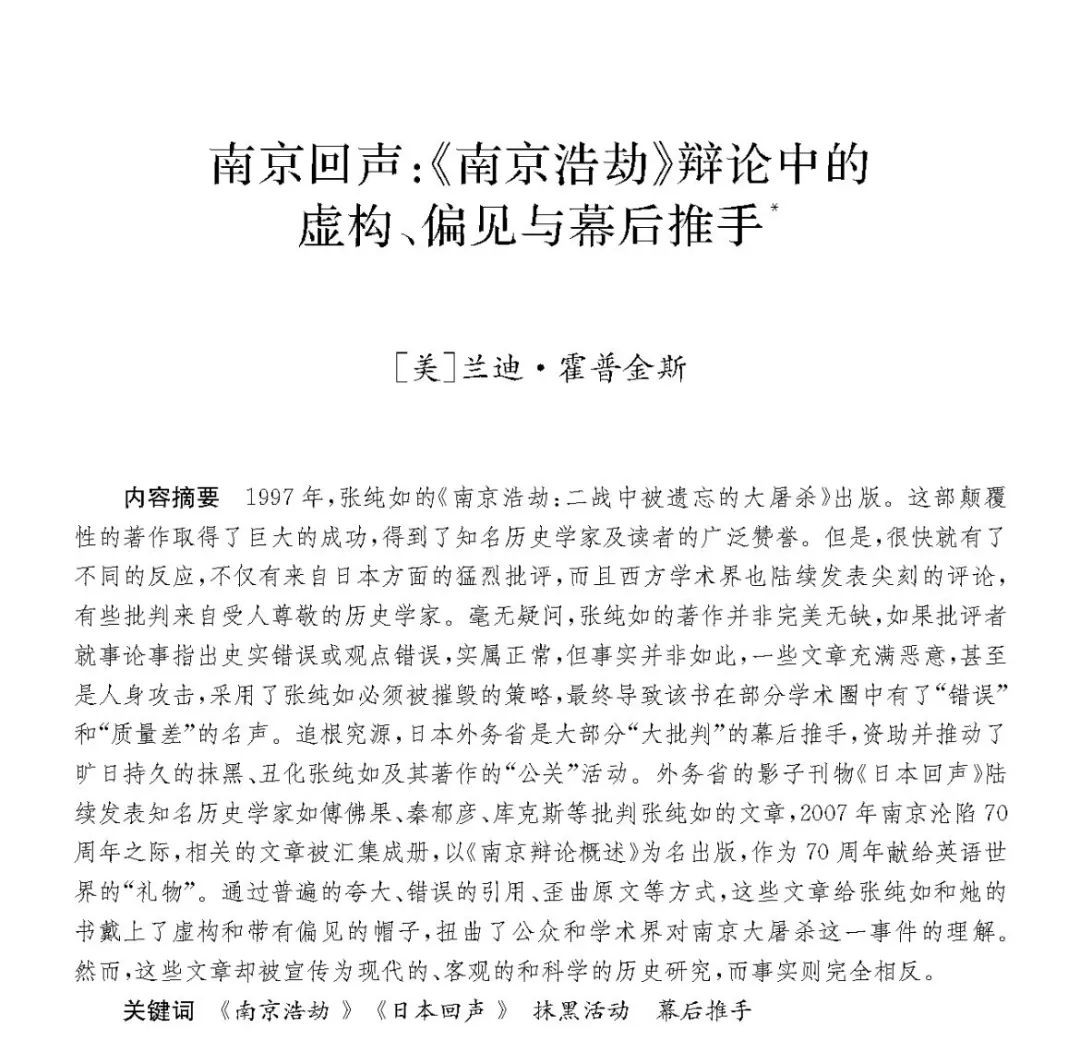 近期,美国波特兰州立大学历史系顾问兰迪·霍普金斯的论文《南京回声:<南京浩劫>辩论中的虚构、偏见与幕后推手》(以下简称“《南京回声》”)在我馆期刊《日本侵华南京大屠杀研究》上发表。该论文揭露了一场针对张纯如的诋毁运动,追根究源,日本外务省是大部分“大批判”的幕后推手,资助并推动了旷日持久的抹黑、丑化张纯如及其著作的“公关”活动。该论文刊出不久,《澎湃新闻》、《中国现代史》全文转载,获得海内外广泛关注。