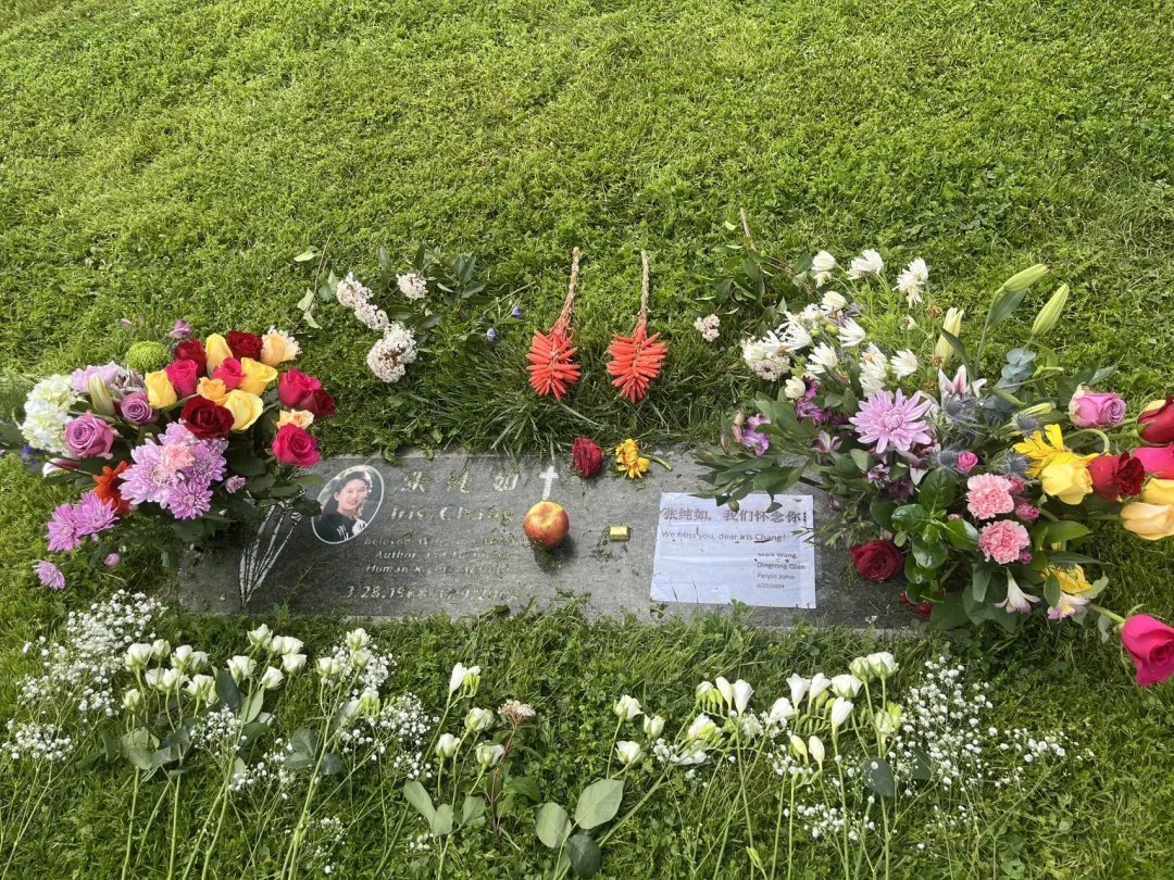 被鲜花包围的张纯如墓碑(摄影:LilyYao 么丽,来源:张纯如公园义工群)