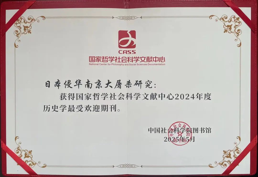 2025年5月16日—17日,“学术期刊高质量发展研讨会暨国家哲学社会科学文献中心最受欢迎期刊报告发布会”在京举行。会议发布了《国家哲学社会科学文献中心最受欢迎期刊报告(2024年度)》,218种中文期刊成为“最受欢迎期刊”。《日本侵华南京大屠杀研究》杂志获“历史学最受欢迎期刊”。中国社会科学院院长、党组书记高翔为“最受欢迎期刊”代表颁发证书。