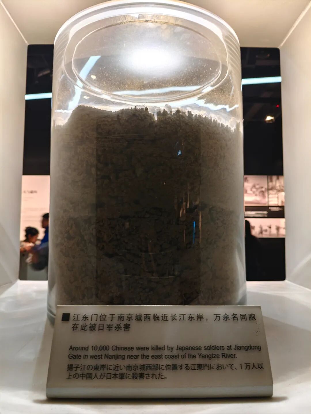 “你看图片说明上写着,这些土是从南京城各处南京大屠杀遇难同胞丛葬地和集体屠杀遗址采集来的。”