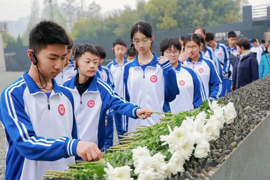 在纪念馆集会广场,全体师生肃立,向南京大屠杀死难者敬献花圈,全体人员低头默哀,深切缅怀遇难同胞。12名师生代表共同撞响和平大钟。庄重肃穆的仪式让师生们更加深刻地认识到,从卢沟桥燃起的抗战烽火到南京大屠杀的惨痛教训,历史需世代铭记。