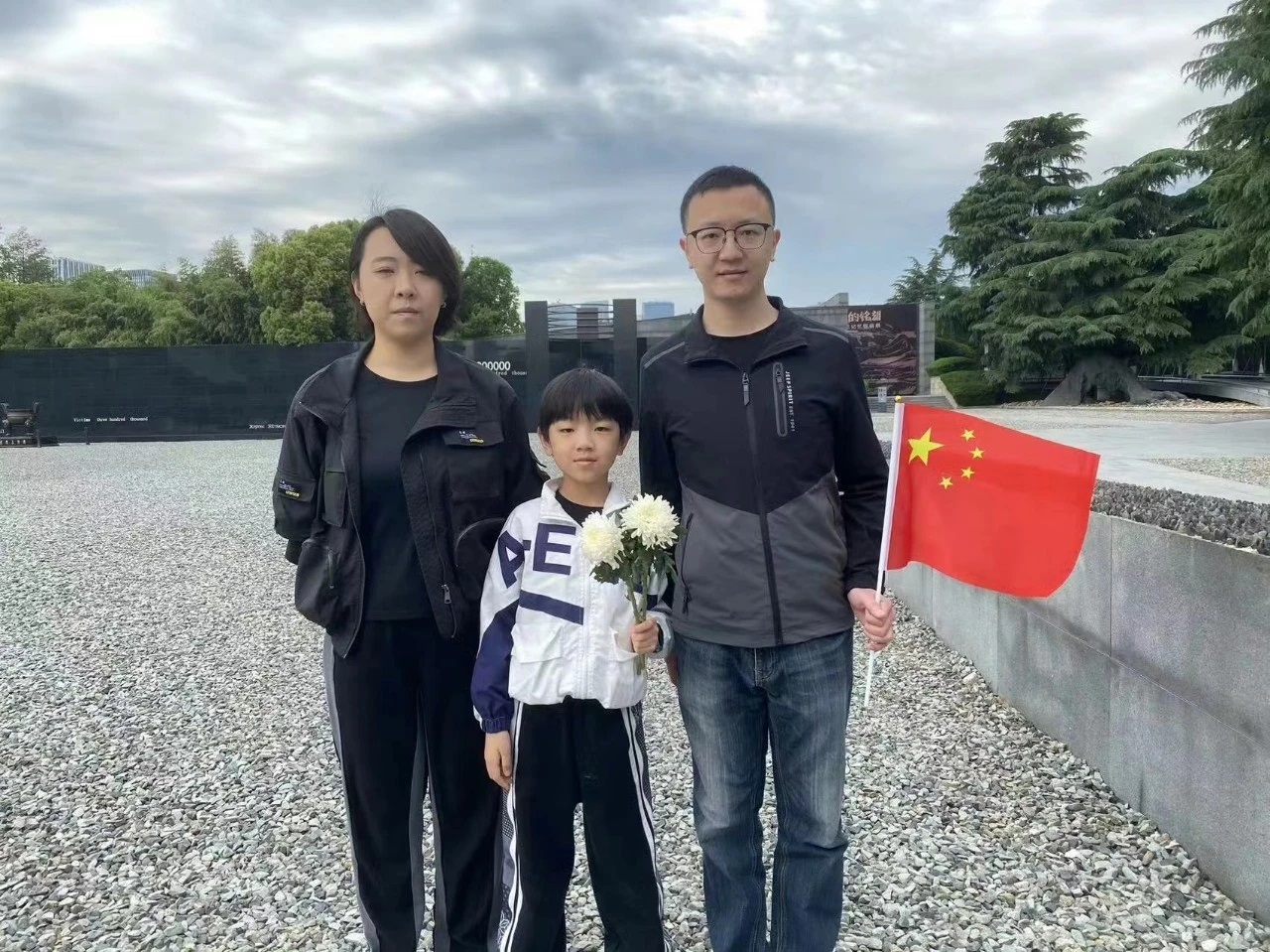 山东淄博观众陆先生一家三口来到纪念馆参观。他们提前7天就在纪念馆官方微信公众号上预约,直到4月27日终于约到5月2日的参观名额。当天,一家人早早就来到纪念馆,还作为首批观众参与撞响和平大钟仪式。陆先生说:“每个中国人都不应该忘记这段历史,我的孩子名叫'俊铭',铭就是铭记的意思。他今年10岁,我相信参观纪念馆会让孩子有深刻地体会,也会让他更加热爱祖国。”