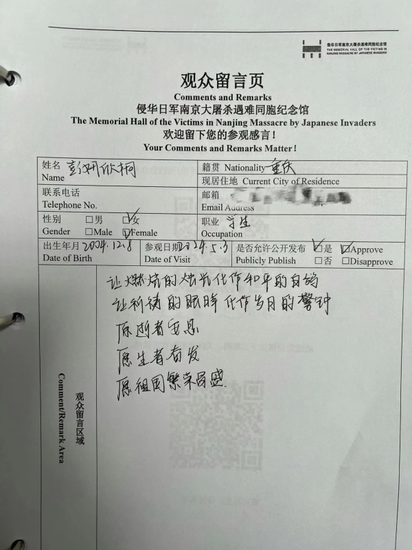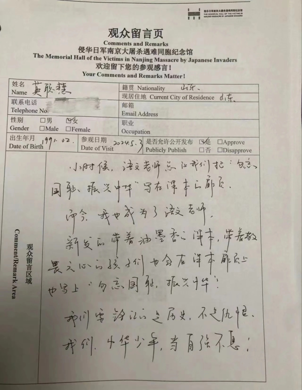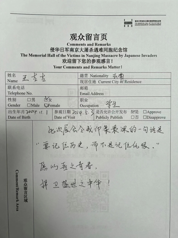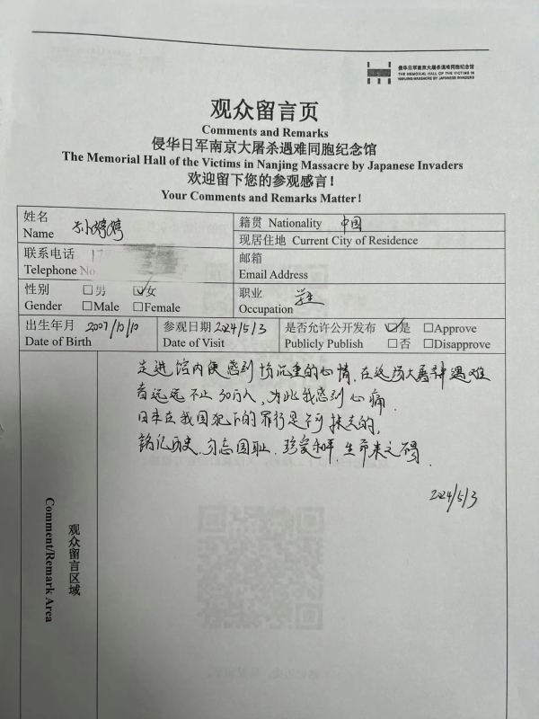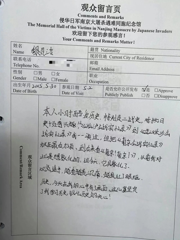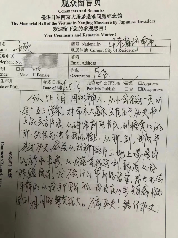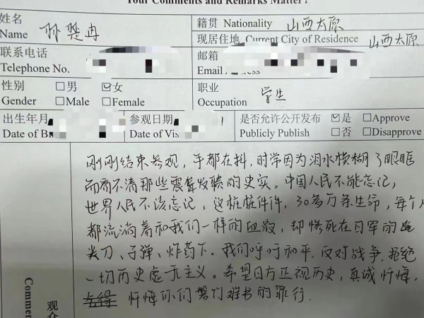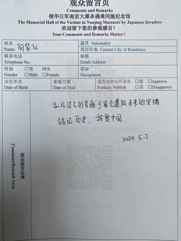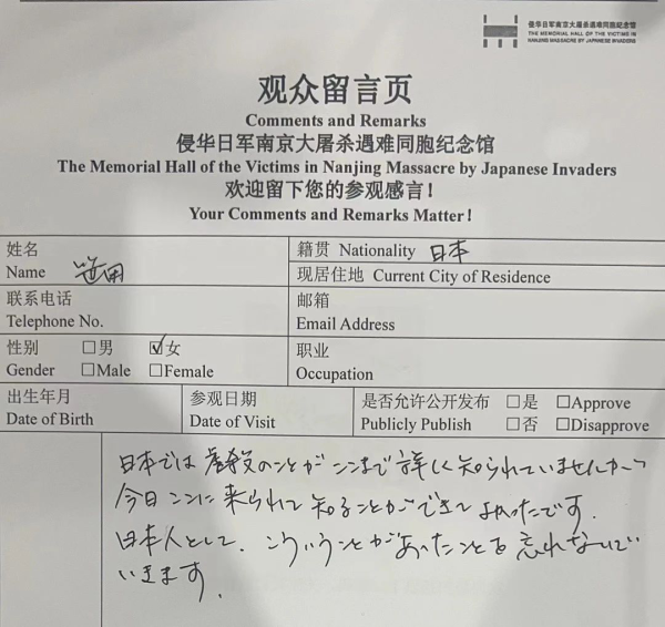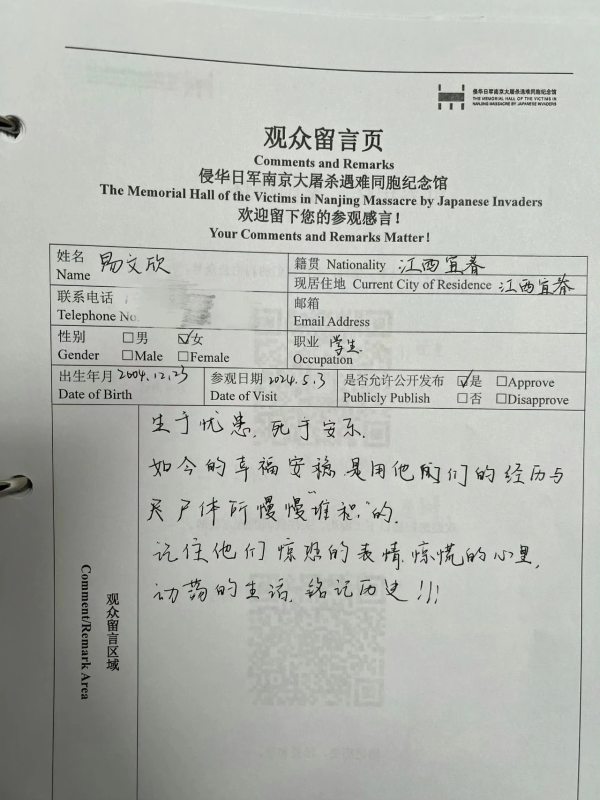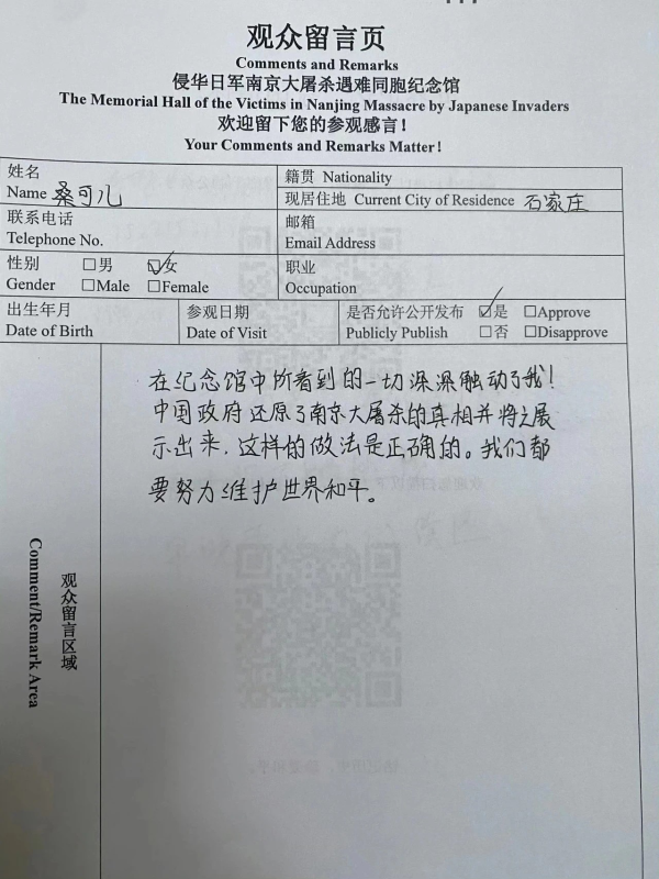 小长假5天,纪念馆累计收到2636份观众留言。一位日本观众留言写道:“在日本的时候没有这么详细地了解到侵华日军南京大屠杀,今天来这里参观很有收获。作为日本人,不会忘记这段历史。”