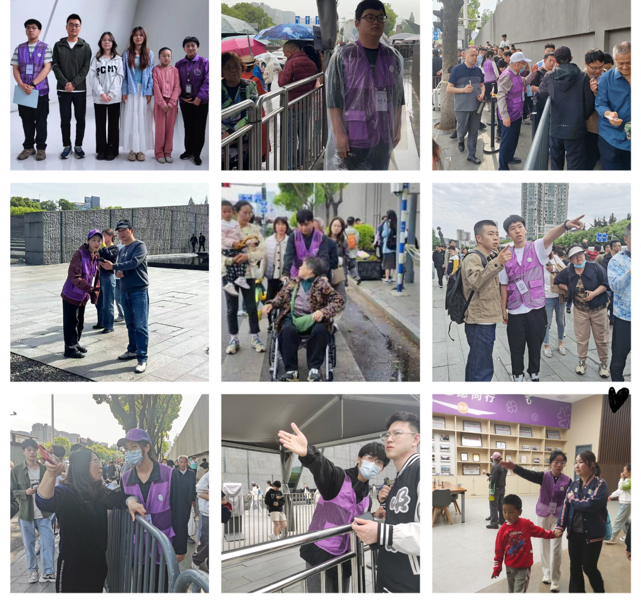 纪念馆每天有约50名紫金草志愿者在馆内一线轮流值班服务观众。在停车场入口、一号门预检通道口、展厅内黑匣子遗骨坑旁、展厅出入口等地,均能看到他们穿着紫色马甲的身影。