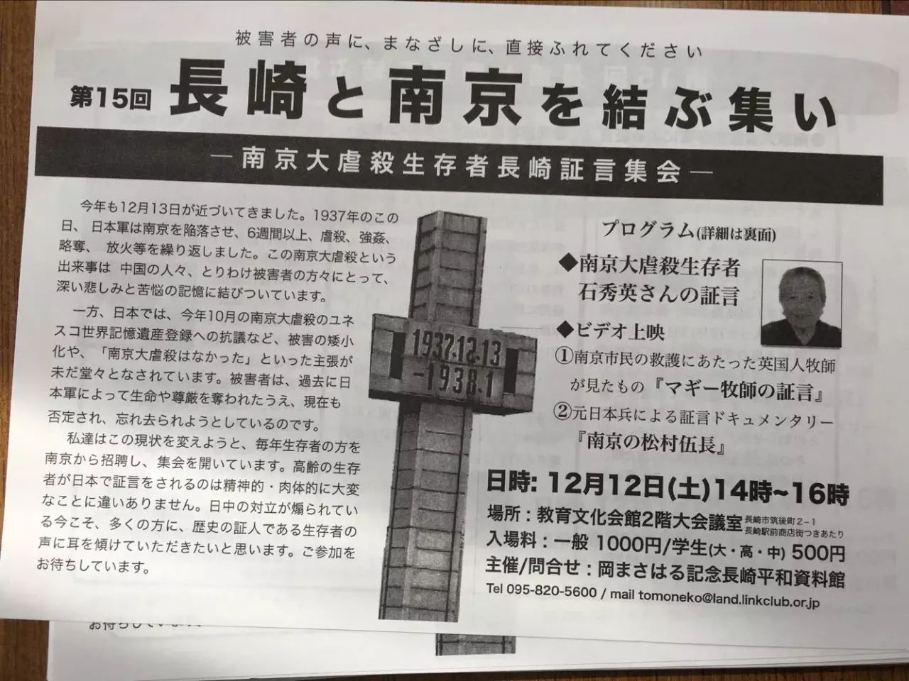 2015年12月9日至14日,石秀英赴日本熊本、长崎、福冈等地参加南京大屠杀幸存者证言集会。