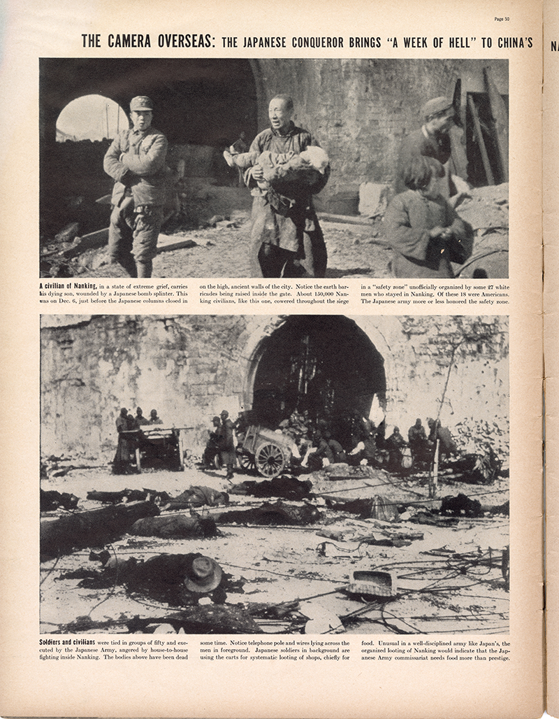 这本杂志的“海外摄影”专栏刊登了《征服者日本军在中国首都“地狱般的一周”》一文,以外国记者的视角叙述了南京大屠杀事件,在当时引起了西方社会的强烈反响。