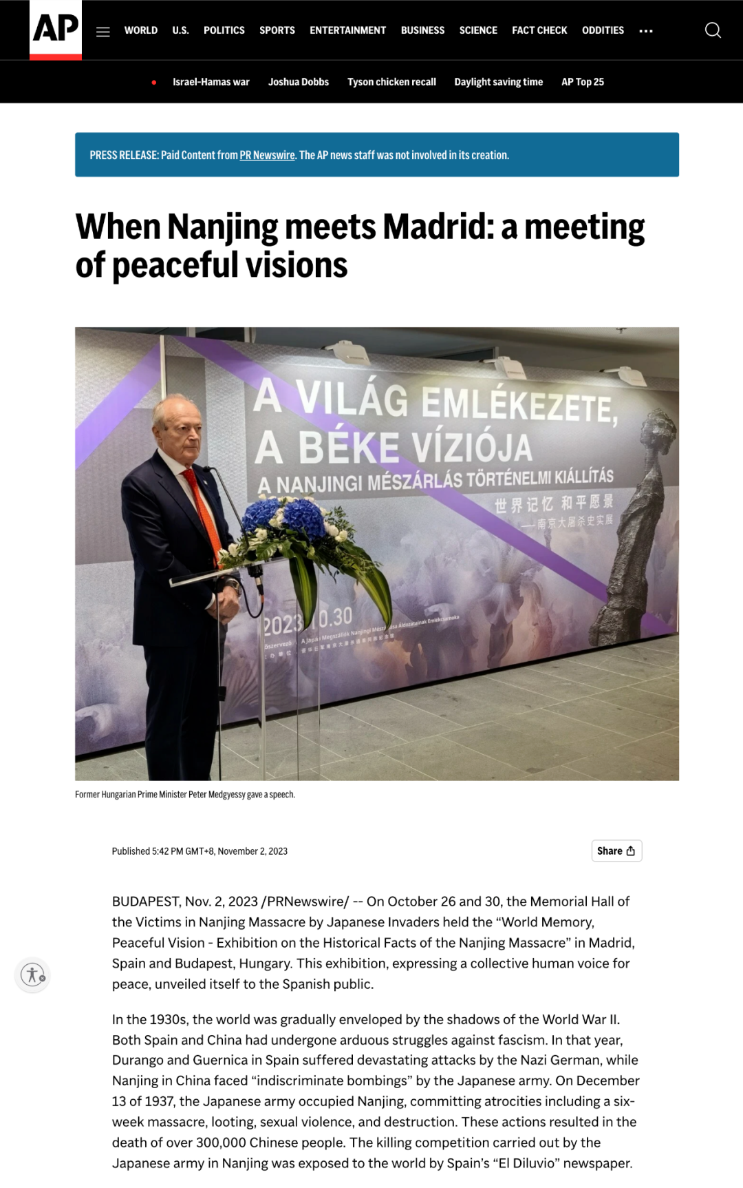 ▲The "Memory of the World Vision for Peace Exhibition of the Nanjing Massacre" opened in Budapest, Hungary.