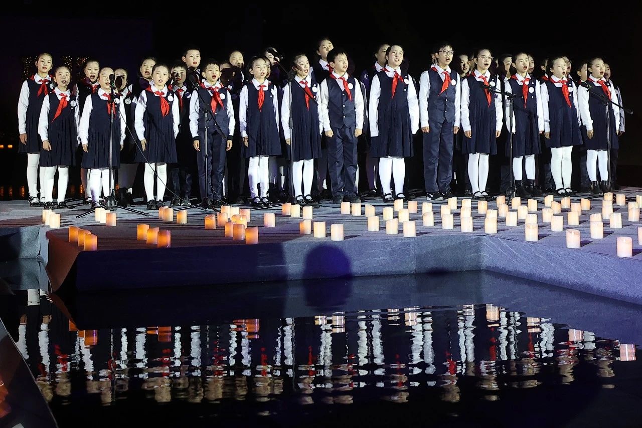 "We will continue to light the spark of peace. Just as the morning star dispels the shadows of darkness, dawn will come, bringing a warm glimmer of light, uniting our shared wishes into an immortal force..." On both sides of the stage, the children of the Zijin Grass Art Troupe's Children's Choir held candles in their hands, presenting for the first time their specially composed original song Peace Blowing Over Zijin Grass, using music to memorialize and soothe the hearts of the people, and conveying the prayers for peace.