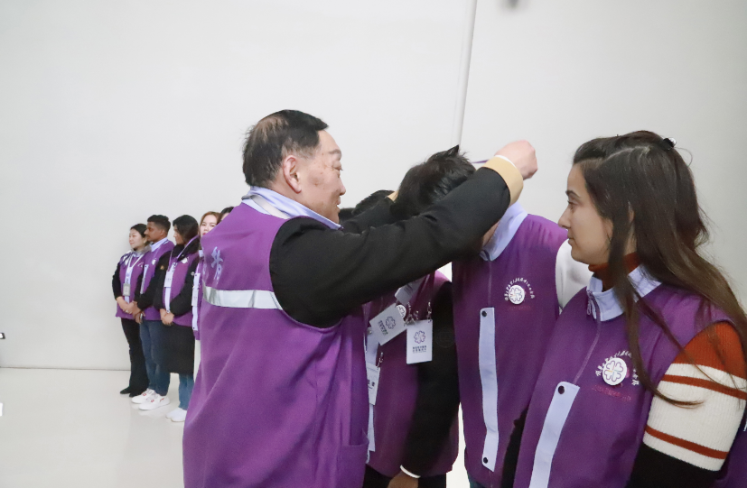 This morning, a volunteer badge-awarding ceremony was held at the Memorial Hall. Volunteer representatives Li Guorong and Fu Yunsheng presented volunteer service badges to the new volunteers.