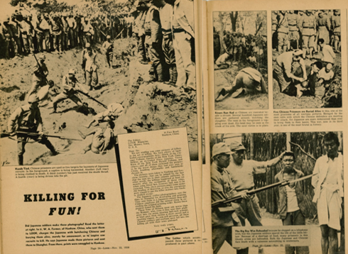An issue of the American magazine LOOK dated November 22, 1938, acquired by the Memorial Hall, features an article titled “Killing for Fun” on pages 54-55 and four photographs exposing the atrocities committed by the Japanese army.