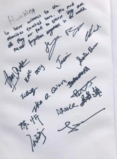 Hugh Findlay, head of the delegation, led to write down some words on the guest book. "Having the opportunity to visit the place where the Japanese atrocities were recorded, I feel it is the responsibility of each of us to remember and disseminate this history," he wrote. Then all the members signed below.