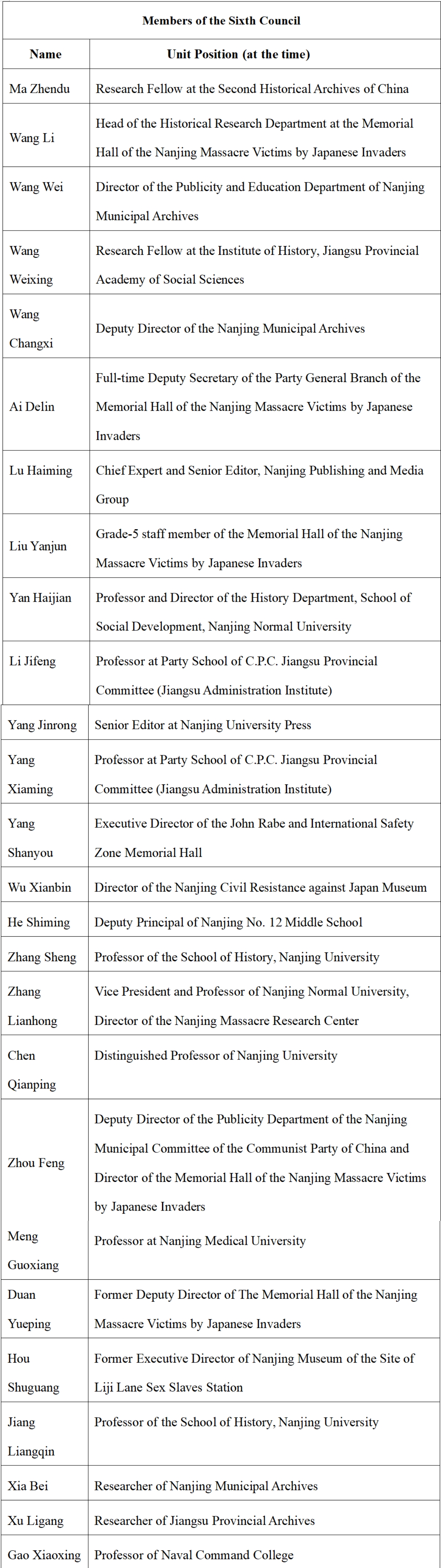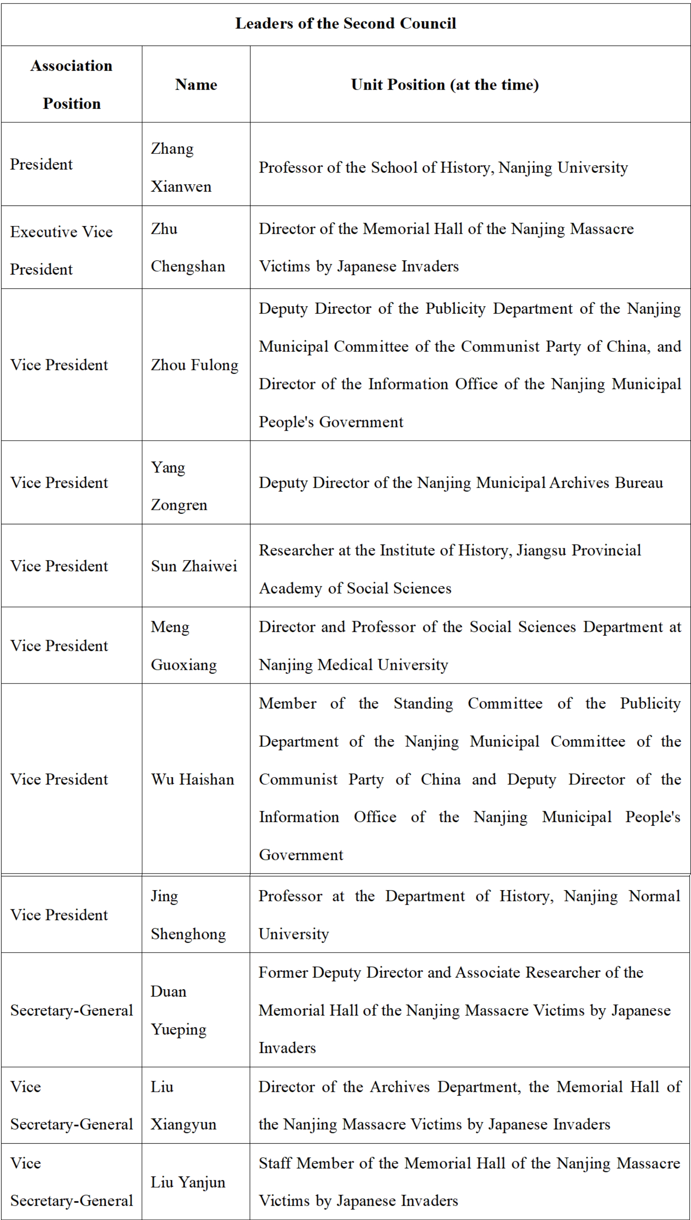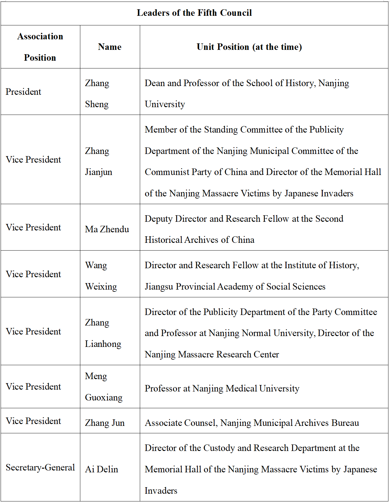 On August 14, 1995, The Research Association of the History of Nanjing Massacre by Japanese Invaders was established, affiliated with the Memorial Hall of the Nanjing Massacre Victims by Japanese Invaders. It is the earliest academic organization in China dedicated to the study of the history of the Nanjing Massacre. Composed of experts and social workers in Nanjing who engage in research on the Nanjing Massacre and related issues, it is an academic, non-profit, and regional social group. The main purpose of the association is to advance research on the Nanjing Massacre and the history of Japanese wartime atrocities, uphold historical truth, conduct patriotic education, and carry out international exchanges for peace and friendship, thereby contributing to peace and development for humankind. The association operates under the guidance and management of its supervisory unit, the Nanjing Federation of Social Sciences Circles, and the registration administration authority, the Nanjing Civil Affairs Bureau. In February 2023, the Sixth Congress of Members was convened, at which a new council was elected. The current president is Professor Zhang Sheng from the School of History at Nanjing University.