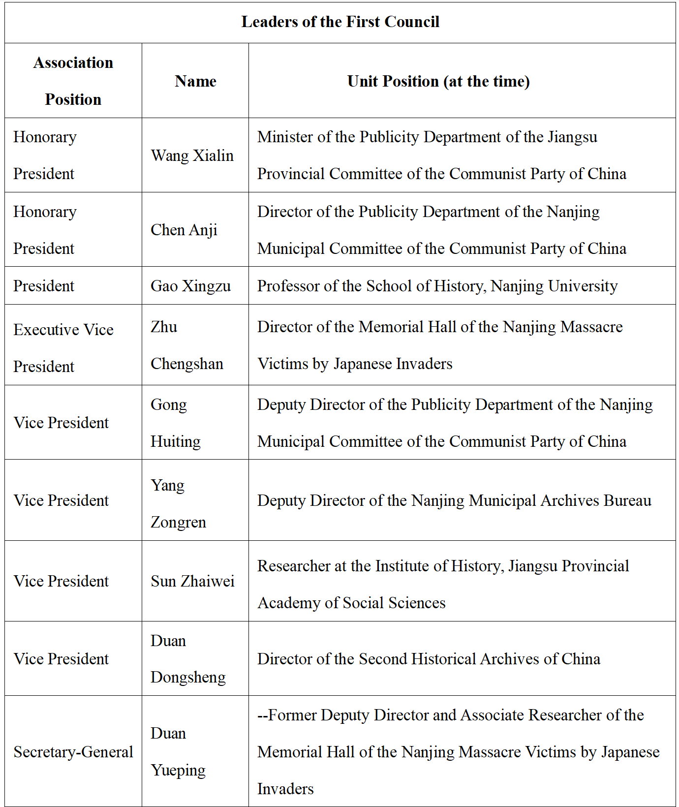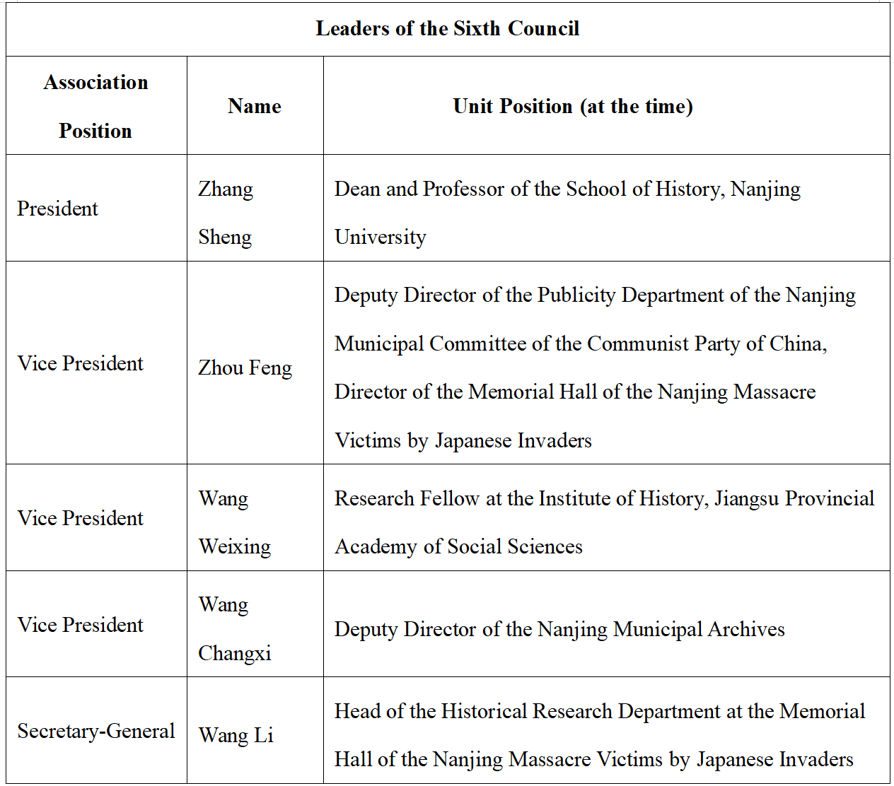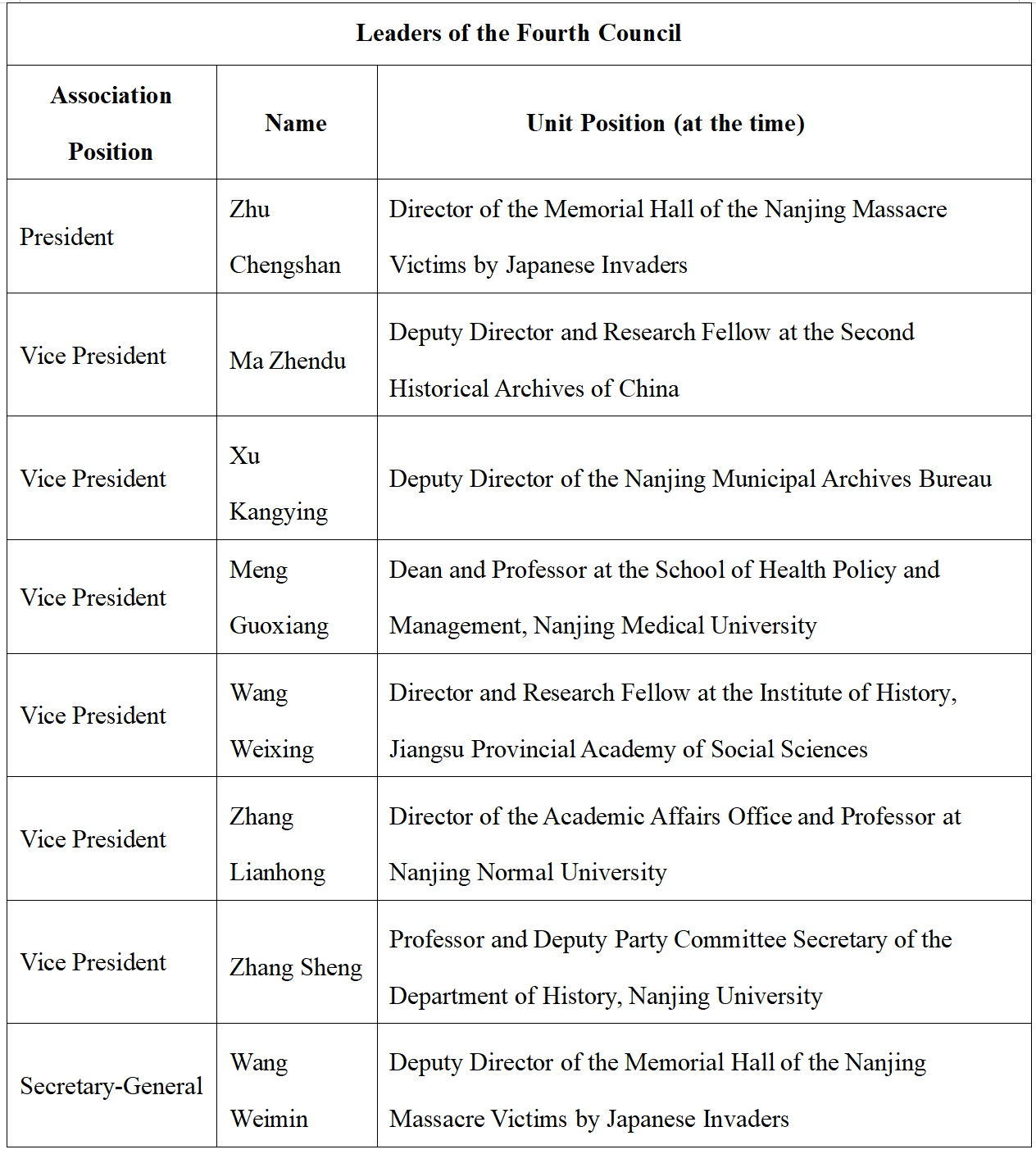 On August 14, 1995, The Research Association of the History of Nanjing Massacre by Japanese Invaders was established, affiliated with the Memorial Hall of the Nanjing Massacre Victims by Japanese Invaders. It is the earliest academic organization in China dedicated to the study of the history of the Nanjing Massacre. Composed of experts and social workers in Nanjing who engage in research on the Nanjing Massacre and related issues, it is an academic, non-profit, and regional social group. The main purpose of the association is to advance research on the Nanjing Massacre and the history of Japanese wartime atrocities, uphold historical truth, conduct patriotic education, and carry out international exchanges for peace and friendship, thereby contributing to peace and development for humankind. The association operates under the guidance and management of its supervisory unit, the Nanjing Federation of Social Sciences Circles, and the registration administration authority, the Nanjing Civil Affairs Bureau. In February 2023, the Sixth Congress of Members was convened, at which a new council was elected. The current president is Professor Zhang Sheng from the School of History at Nanjing University.