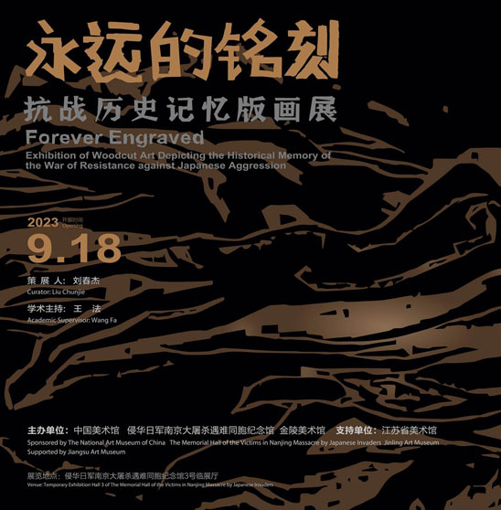 《永远的铭刻——抗战历史记忆版画展》由中国美术馆、侵华日军南京大屠杀遇难同胞纪念馆、金陵美术馆共同主办,江苏省美术馆支持。展览分为“铁蹄之下”“南京浩劫”“抗争到底”“万众一心”“记忆传承”,汇集了中国美术馆、江苏省美术馆、金陵美术馆和纪念馆所藏的版画作品,以及现当代创作的版画作品共141幅,展览将“抗战中的版画”与“版画中的抗战”相结合,既通过版画艺术展示伟大抗战精神,又体现版画艺术的薪火相传。