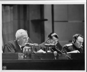 1948年11月5日,法庭继续宣读判决书。中国法官梅汝璈(中)和俄罗斯法官柴扬诺夫(右)在法官席上