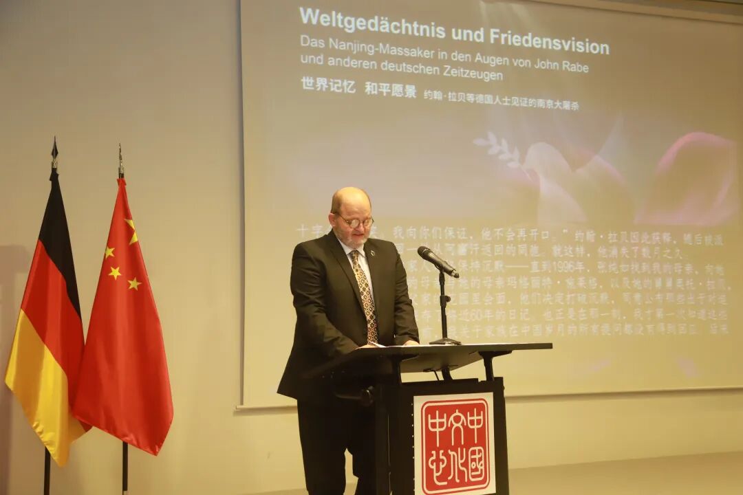国际友人约翰·拉贝的曾外孙克里斯托夫·赖因哈特在致辞中动情地回顾了家族记忆和他的寻根之旅。他回忆了曾外祖父被盖世太保带走审讯的往事,也见证了家人为公布尘封60年的日记而打破沉默。多年来,他并未真正理解曾外祖父在中国人民心中的地位。直到亲赴南京,在纪念馆里,在南京的旧居门前,他才终于找回生命中缺失的拼图。他亲眼看到、听到、感到中国人民将约翰·拉贝视为亲人,这份铭记,是对历史最好的告慰,大爱从未被遗忘。