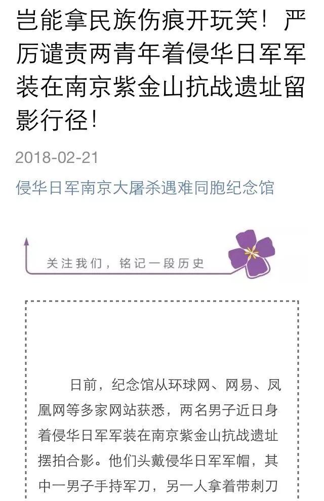 侵华日军南京大屠杀遇难同胞纪念馆面对“精日”舆情,利用新媒体平台第一时间权威发声,官方微博、微信同时推送《岂能拿民族伤痕开玩笑!严厉谴责两青年着侵华日军军装在南京紫金山抗战遗址留影行径》一文,主动引导舆论。文章微博单条阅读量超18万,并被多个国家级官微转发。