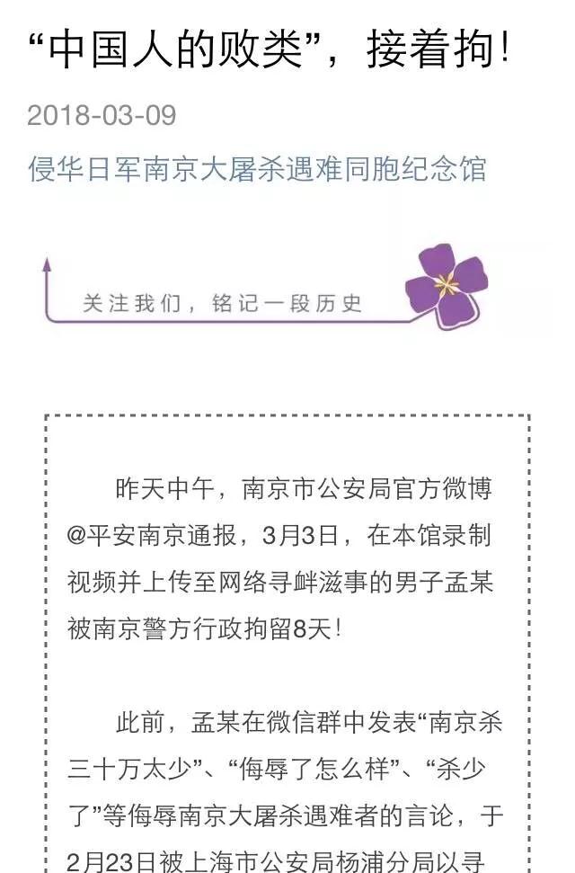 2月22日,在上海发生35岁男子孟某在微信群谩骂、污蔑南京大屠杀遇难者事件。孟某被上海杨浦警方行政拘留5日,拘留期满后,于3月3日来到纪念馆,在刻有“遇难者300000”的墙前录制视频,进行自我炒作。纪念馆于3月5日、8日、9日接连通过官方微博、微信发声。