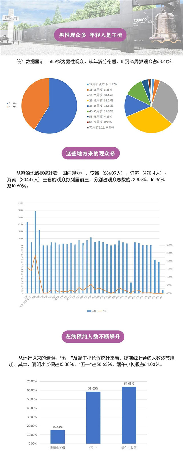 2020年注定是不平常的一年。因为新冠肺炎疫情防控需要,我馆也经历了从临时闭馆到“防疫+预约”开放新模式。据我馆场馆运行部最新统计,3月21日至6月21日,总计有288101名观众通过预约前来参观,其中海外观众264名,超过六成是年轻人。我们通过一图解析观众的年龄层分布、哪些地方的观众来得多,以及这期间,发生在纪念馆里的一线故事。