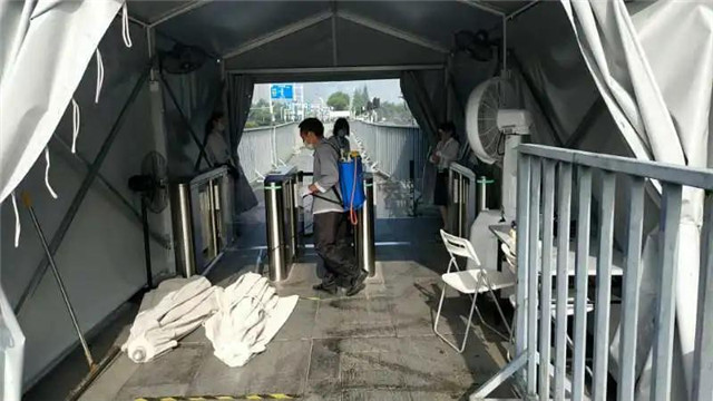 在“防疫?预约”模式下,纪念馆每天有40名保洁员在岗。观众参观流线,每天都要经6次全面消毒,包括展柜、电梯扶手、卫生间等观众容易接触到的地方。在保洁员在包干区反复消毒基础上,纪念馆每天还安排2名消毒员专门负责消毒工作。