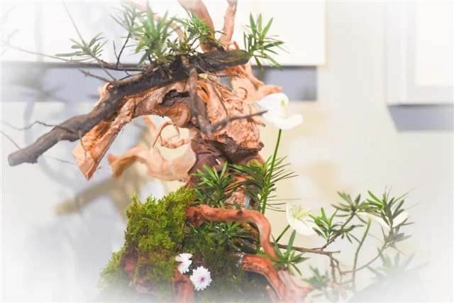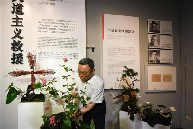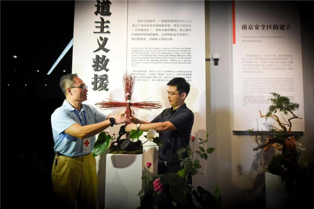 随后,纪念馆馆长张建军将一束和平月季置于盆景中。至此,整部象征和平的花语作品圆满完成。