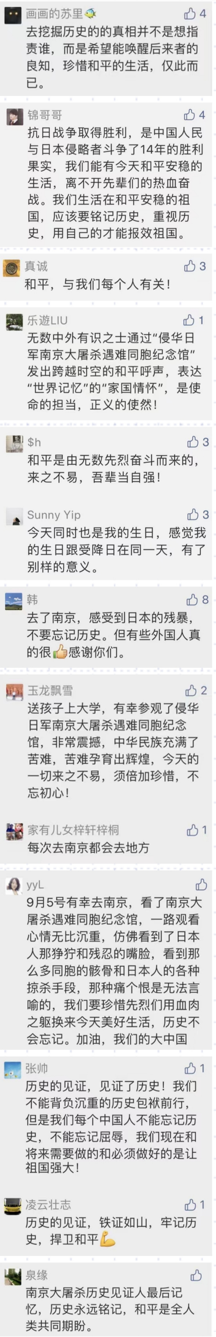 “和平与我们每个人有关”、“每次去南京都会去的地方”、“我们会永远铭记历史”……