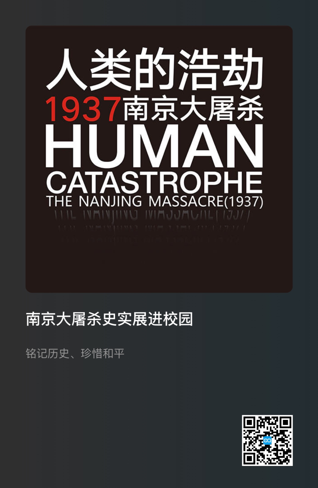 邀您线上看展,扫描下方海报中二维码,共同参观《人类的浩劫:1937南京大屠杀》展览,一起缅怀历史,祈愿和平,砥砺前行。