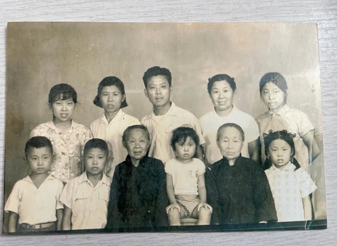年轻时的谢桂英(上排右二)和母亲(前排左三)等家人合影