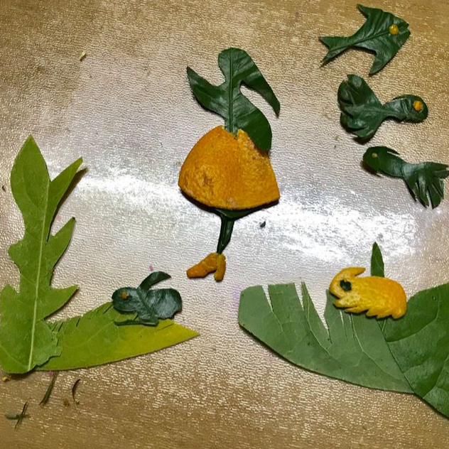 用橘子皮、树叶做的创意剪贴画