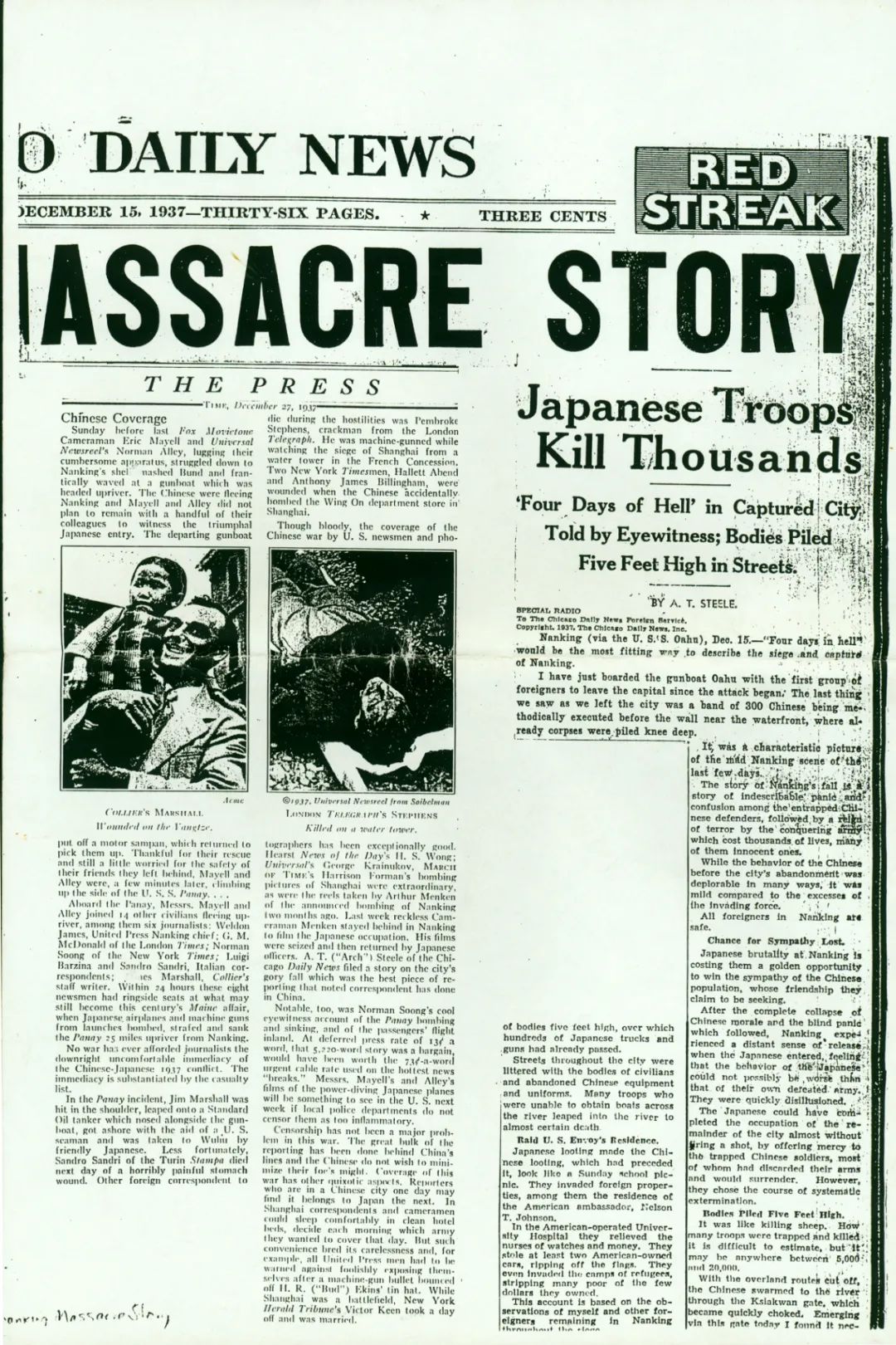 12月15日,斯蒂尔等西方记者经过与日军当局交涉,最终获准乘坐美国军舰“瓦胡”号离开南京,前往上海。斯蒂尔一上舰艇就立即赶往发报室,将他手头最新的稿件发送出去。这就是1937年12月15日美国《芝加哥每日新闻报》头版刊登的《日军杀人数千》,副题为“目击者叙述沦陷城市‘四天地狱般的日子’,街道上尸体积有五英尺”。从目前所发现的史料来看,这是南京大屠杀发生后最早见报的有关讯息。