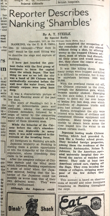 1937年12月18日美国《旧金山纪事报》以《记者描述了南京的混乱》为题,转发了美国记者斯蒂尔的报道:“‘如同在地狱里的4天’是对南京被包围和被占领最恰当的描述。我刚刚登上‘瓦胡’号炮舰,我是自从日军进攻南京以来第一批离开首都的外国人,当我们离开这座城市的时候,看到的最后一幕是300名中国人在江堤前被无情地处决,那里的尸体已经堆积没膝。这是过去几天南京疯狂景象的典型写照。”