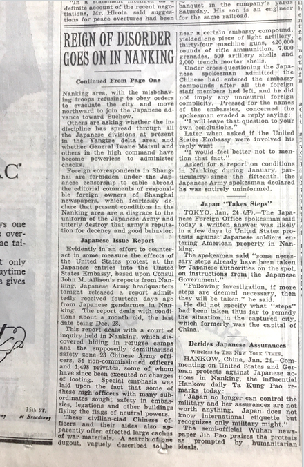 1938年1月25日美国《纽约时报》则有日军在南京持续实施暴行的报道。报道中写道:“南京处于无政府的状态,暴行在持续,秩序混乱。”