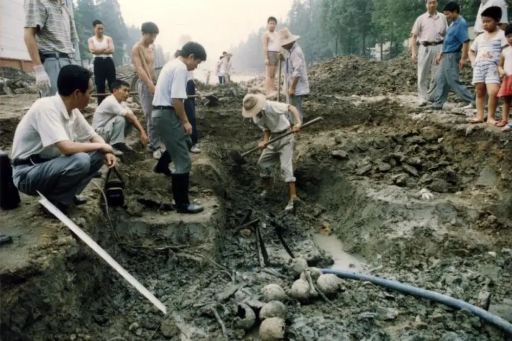 1998年8月18日,在南京一处建筑工地施工过程中,意外挖出41个人头骨和大量肢骨,现场散发刺鼻气味。颅骨、肢骨以及同部位的骨骼被装在长约1米、宽约0.3米的简易木盒子或蒲包里,颜色发黑,味道刺鼻(后考证浓硫酸),并不符合大屠杀抛尸的特征。