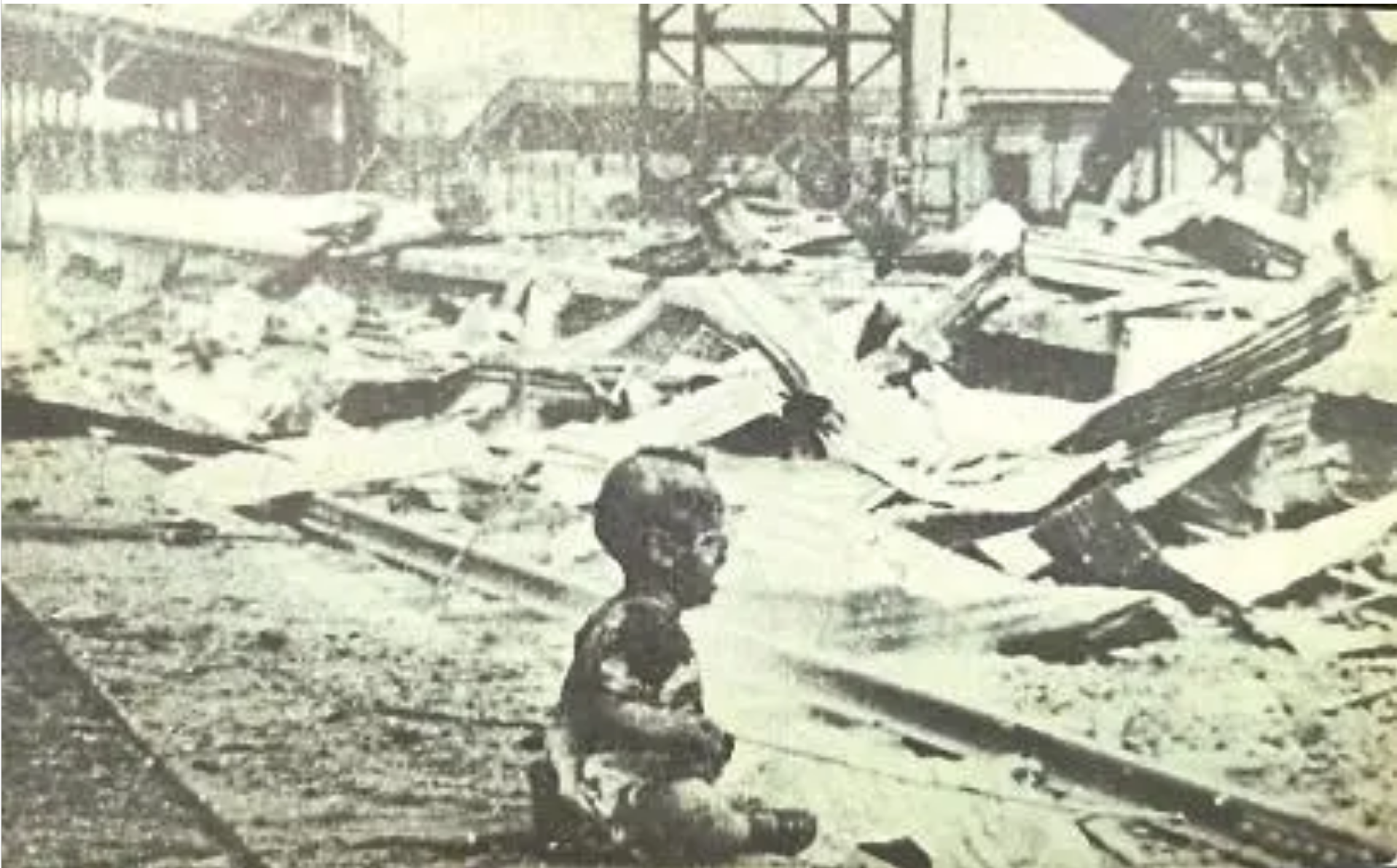 1937年8月,一名摄影记者在当时的上海南站附近拍下的废墟中的婴儿