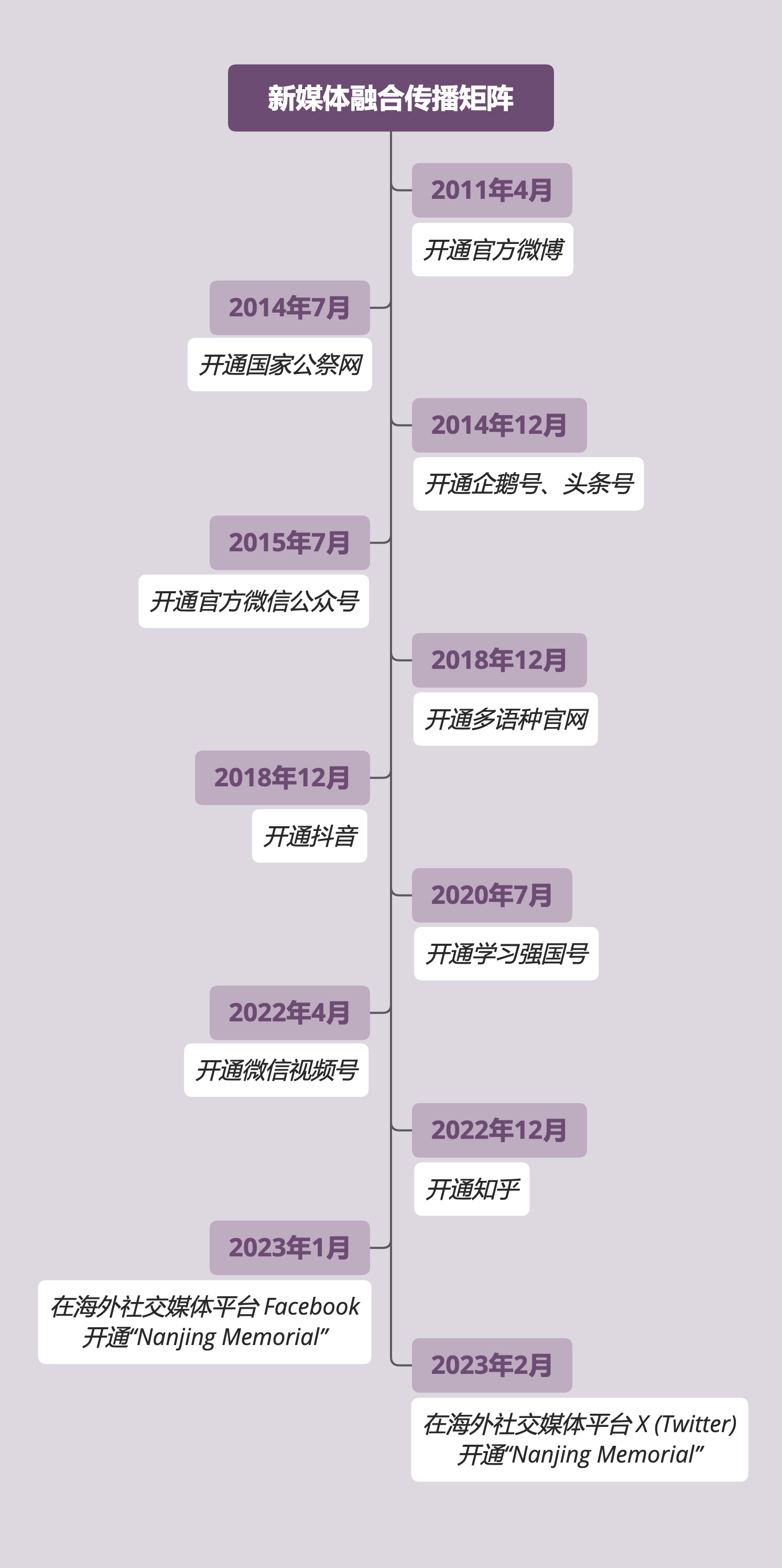 2014年国家立法设立南京大屠杀死难者国家公祭日前,纪念馆仅微博1个新媒体平台。随着互联网科技的发展,人们的阅读习惯和介质都发生了改变。这些年,纪念馆先后开通并建立了11个平台账号为一体的新媒体融合传播矩阵。